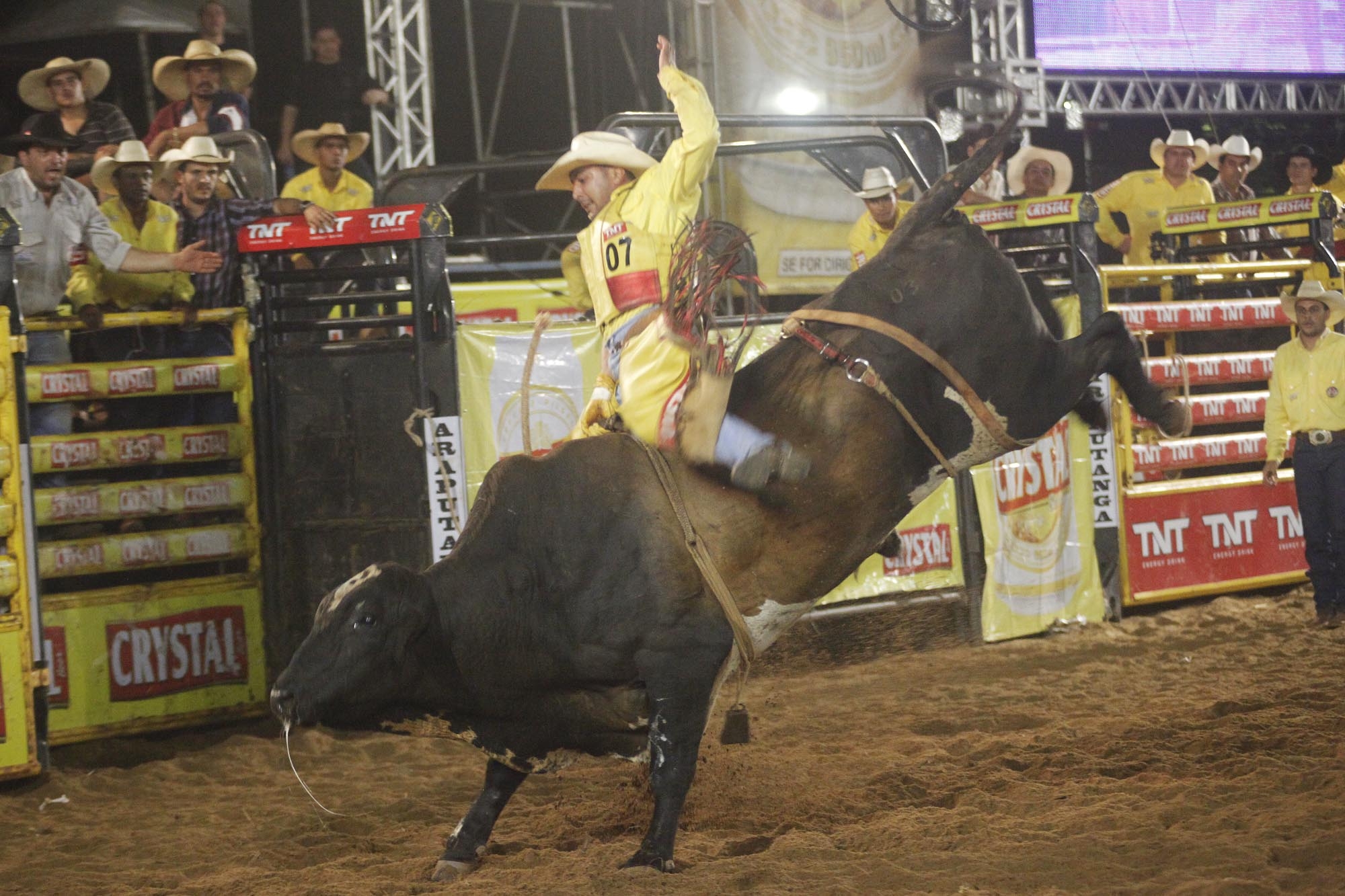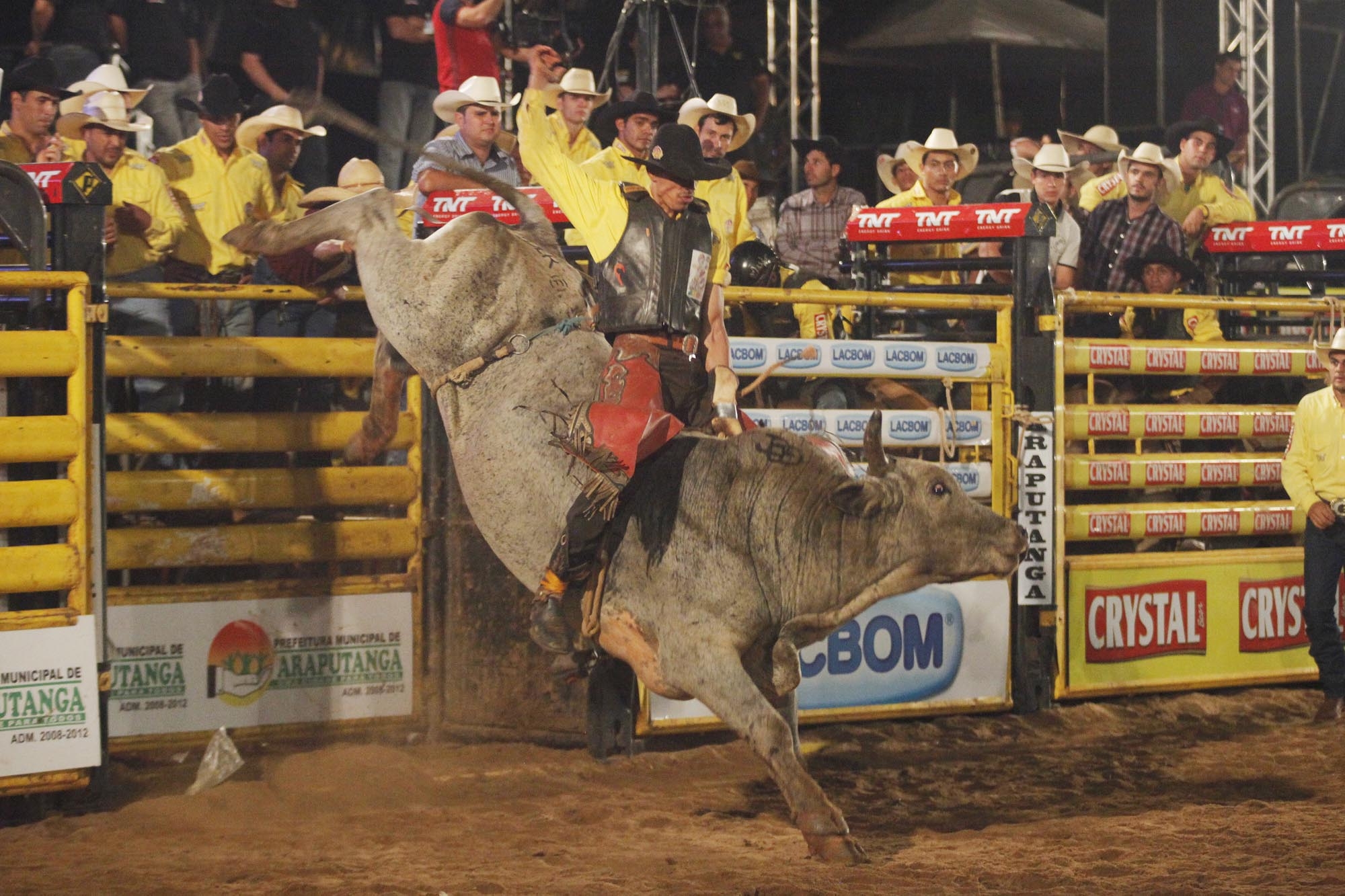 | Estreando no Top Team Cup, a cidade de Araputanga/MT recebeu nesta quinta-feira a seleção brasileira do rodeio para uma etapa da milionária competição que distribuirá mais de R$ 1 milhão em prêmios somente na final. Mostrando que o público do Mato Grosso realmente é apaixonado pelo esporte rodeio, a festa começou com as arquibancadas lotadas, desde a primeira montaria na arena. |