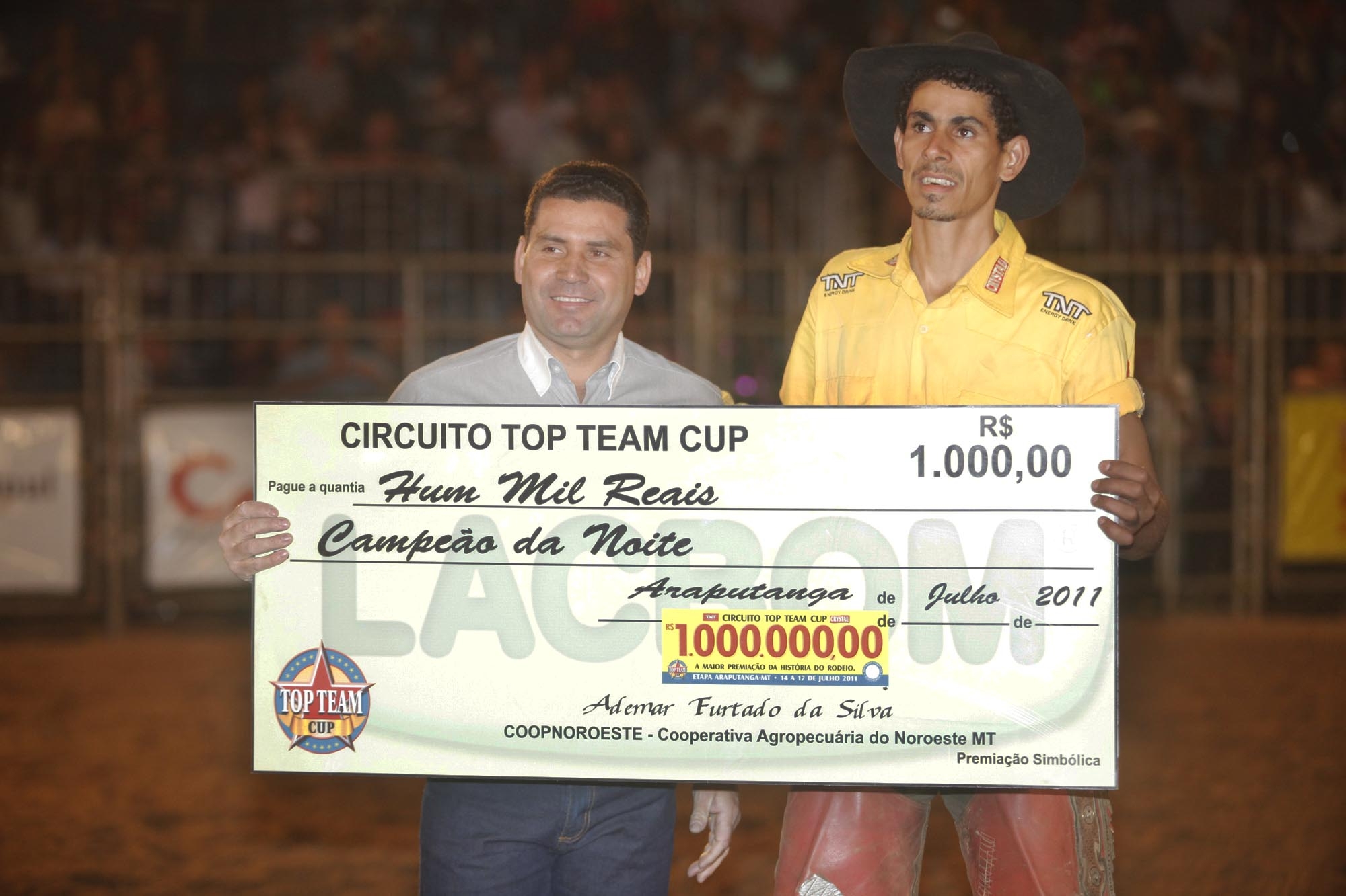 A noite de quinta-feira na arena do Rodeio de Araputanga contou com 39 montarias em touro. Os destaques do rodeio brasileiro, dentre profissionais e competidores, estiveram presentes para mais uma etapa Top Team Cup. O locutor Taturana apresentou os competidores em pista, o comentarista Esnar Ribeiro chamou os profissionais que fazem parte da equipe e com as bênçãos do padre Celso foi aberta a festa. O melhor competidor da noite foi Abrão Moral, da cidade de Água Boa, também no Mato Grosso, que se apresentou no touro Celebridade, da cia Rancho do Cowboy e tirou a nota 89,75.